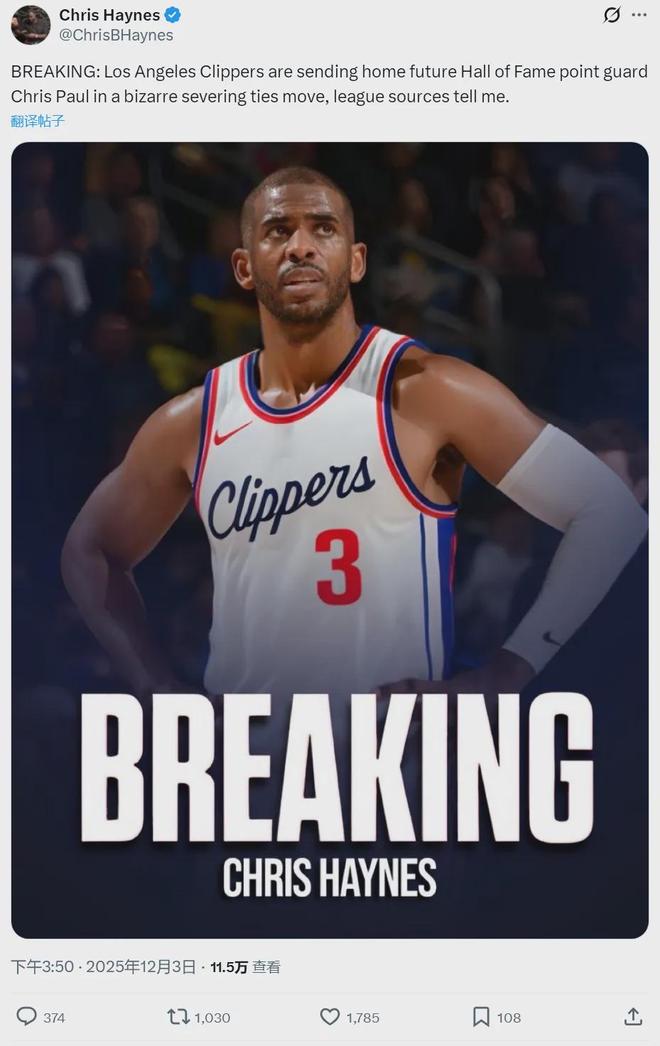 北京时间12月3日下午4点,据NBA名记Chris Haynes报道,保罗已经离开快船,球队深夜将保罗赶回家,双方分道扬镳。这个消息非常突然,因为保罗在快船只是底薪合同。快船目前5胜16负西部倒数第二,没想到保罗第一个离队!