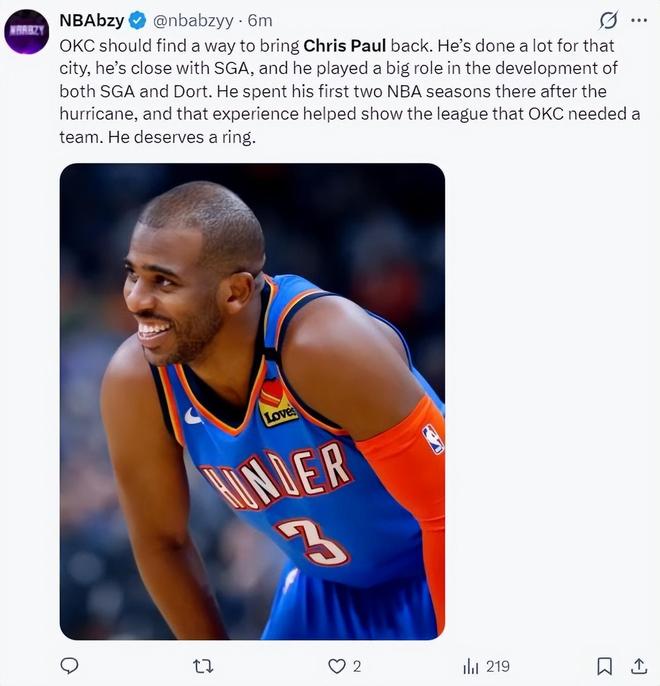 雷霆记者:保罗曾在OKC度过了很美好的赛季,雷霆队本赛季高居联盟第一,我们应该召回保罗让他拿到一枚总冠军戒指退役。