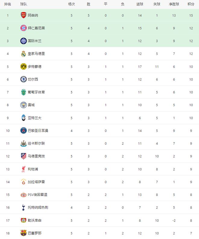 随着阿森纳3-1拜仁 皇马4-3 利物浦1-4 欧冠最新积分榜:榜首易主