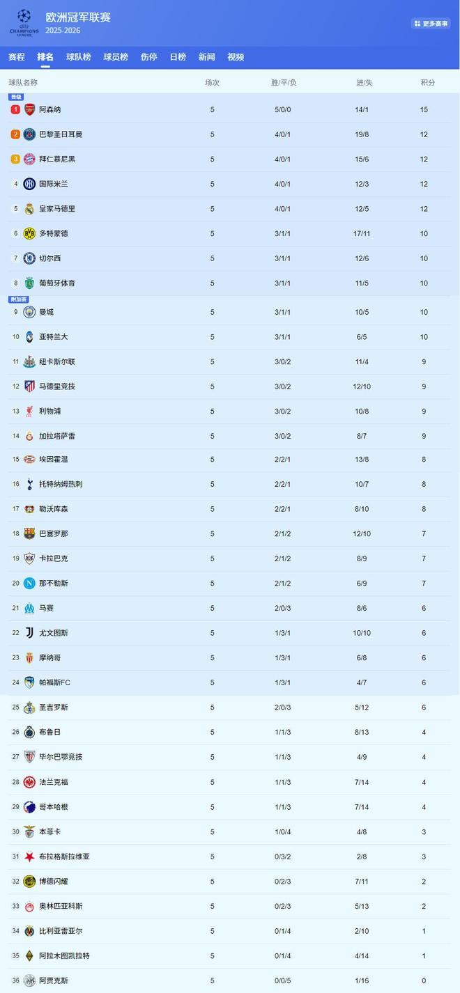 随着皇马4-3,国米1-2被绝杀,欧冠最新积分榜如下,枪手升至榜首