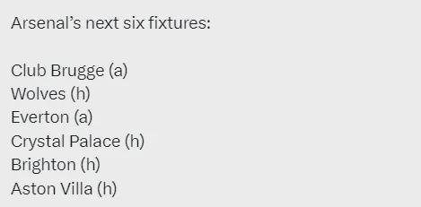 阿森纳未来6场比赛:客战布鲁日、主战狼队、客战埃弗顿、主战水晶宫、主战布莱顿、主战维拉。